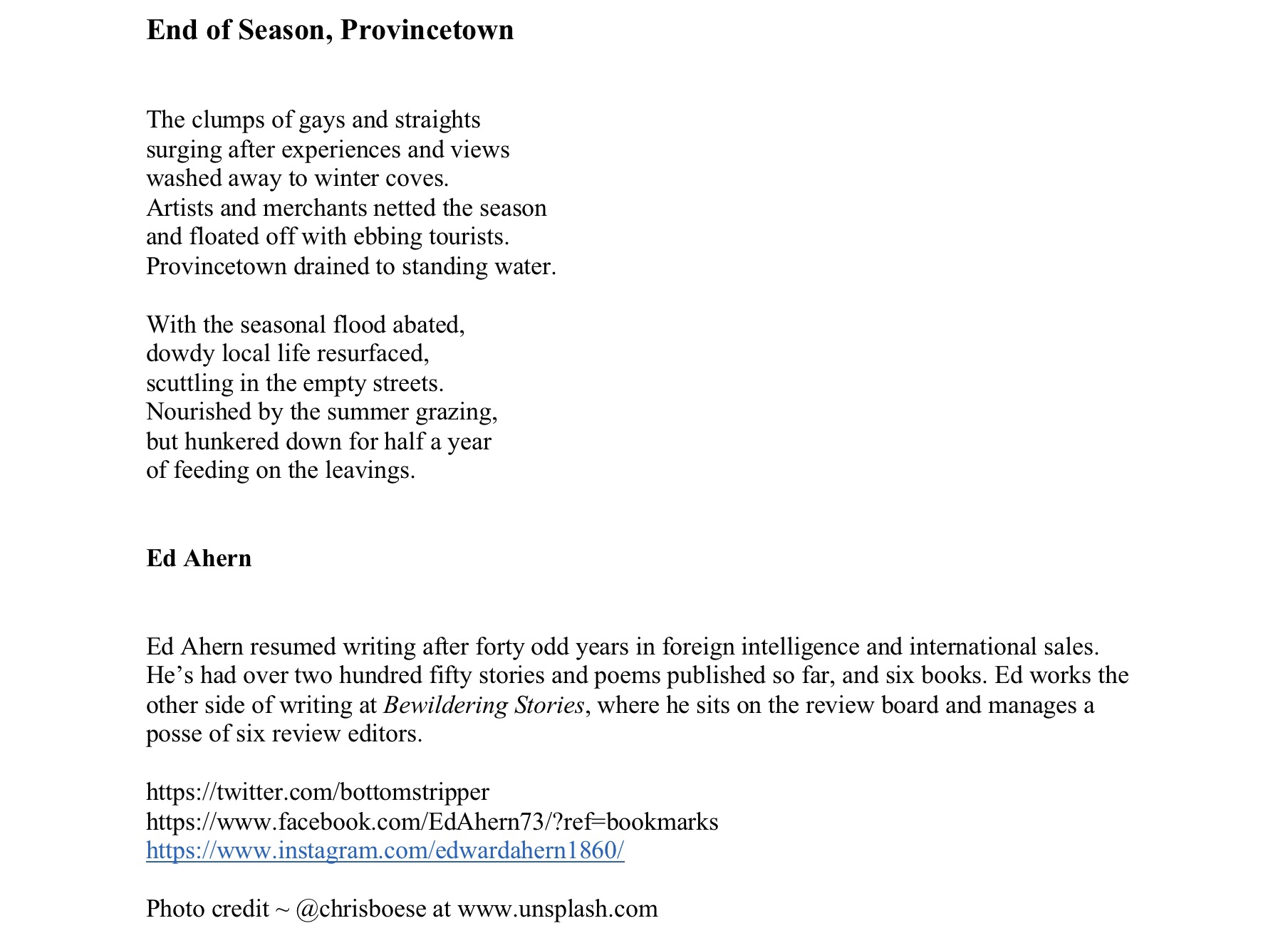 Posted on 3rd Apr 20203rd Apr 2020 by writingatthebeachhutEnd of Season, Provincetown ~ A poem by Ed Ahern Share this: Click to share on X (Opens in new window) X Click to share on Facebook (Opens in new window) Facebook Like Loading...
