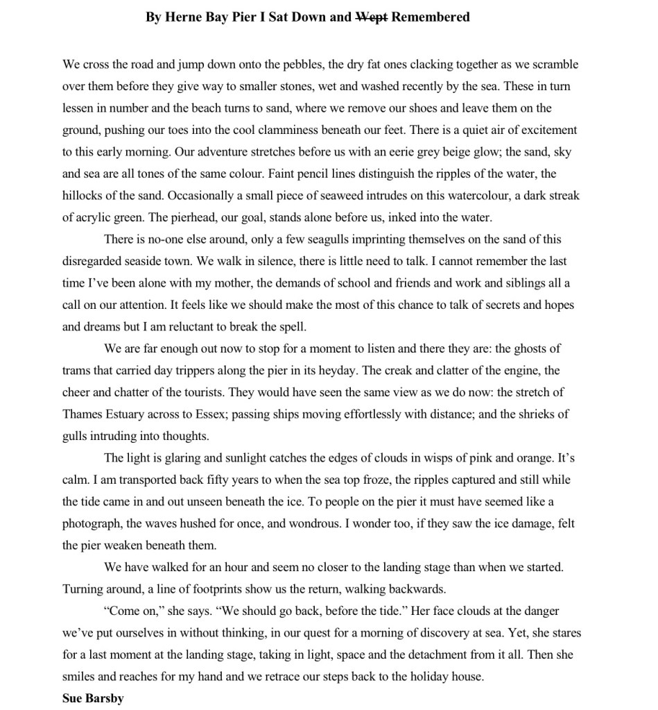 Posted on 2nd Aug 20202nd Aug 2020 by writingatthebeachhutBy Herne Bay Pier I sat Down and Wept Remembered ~ A Flash Fiction piece by Susan E Barsby Share this: Click to share on X (Opens in new window) X Click to share on Facebook (Opens in new window) Facebook Like Loading...
